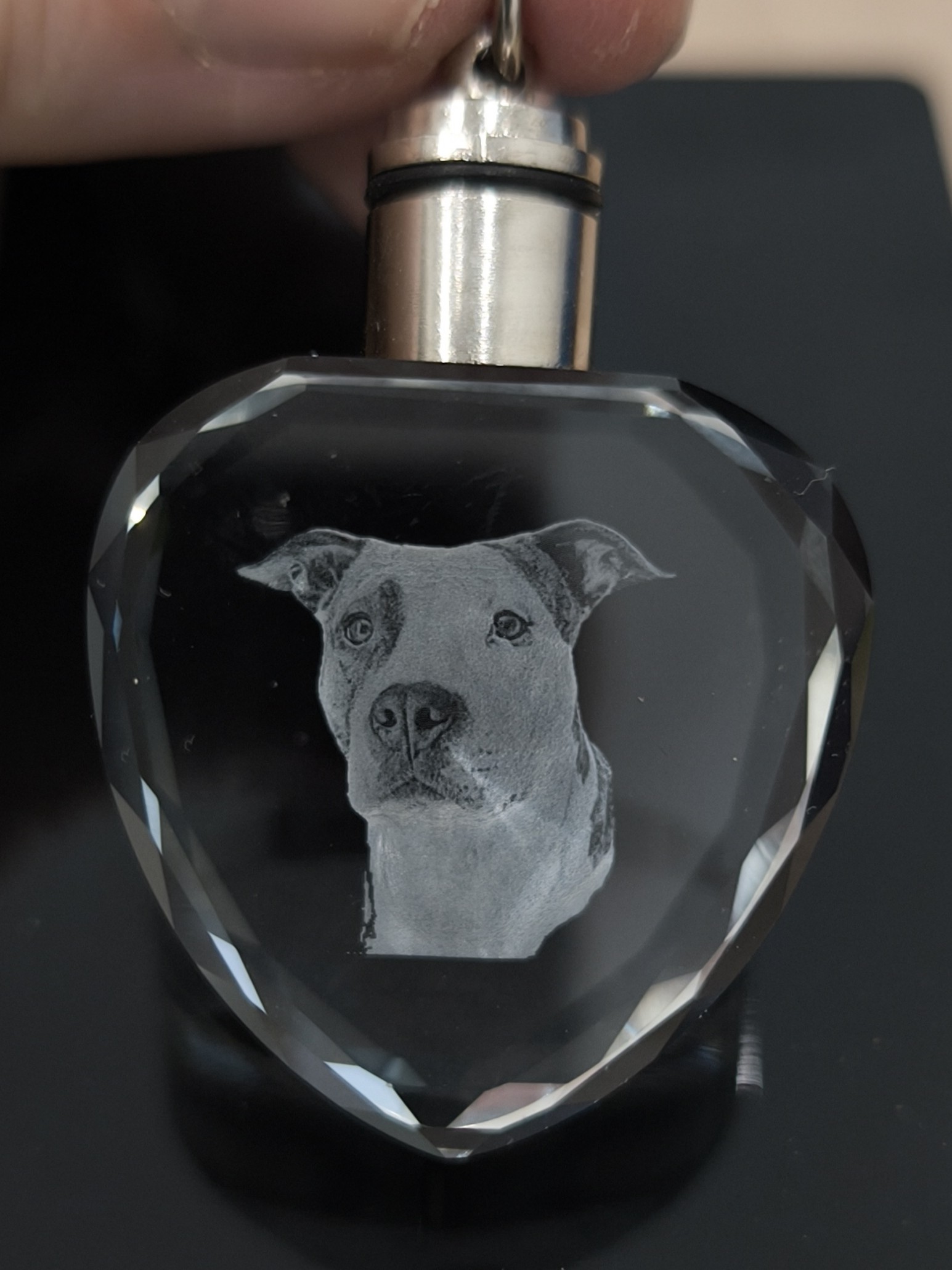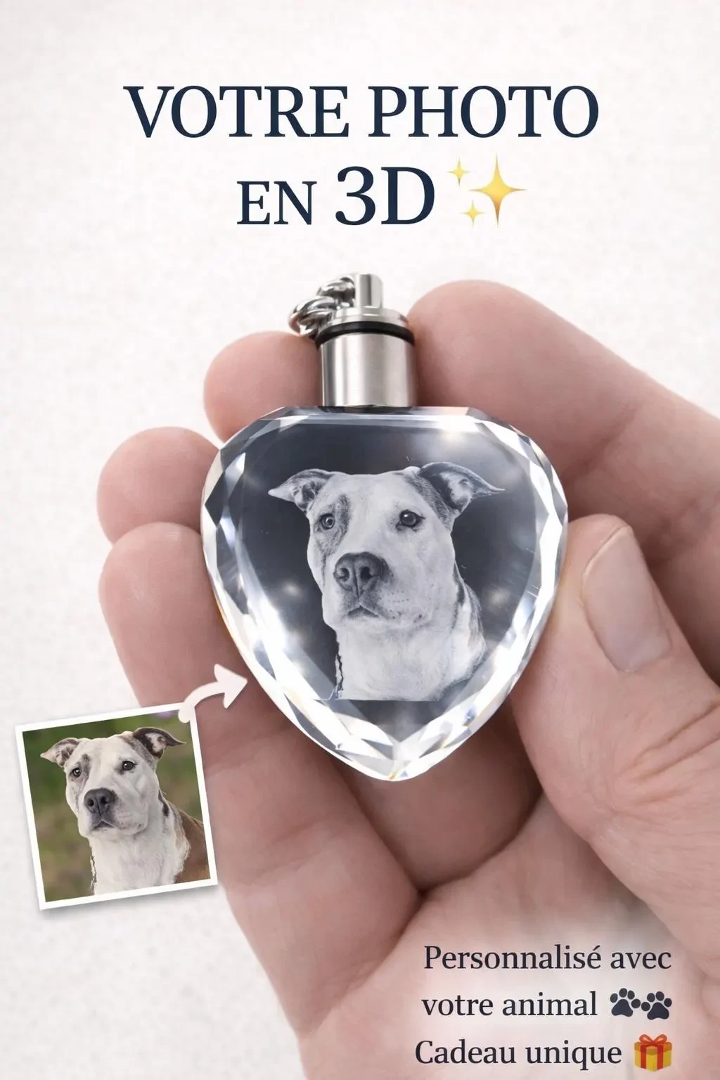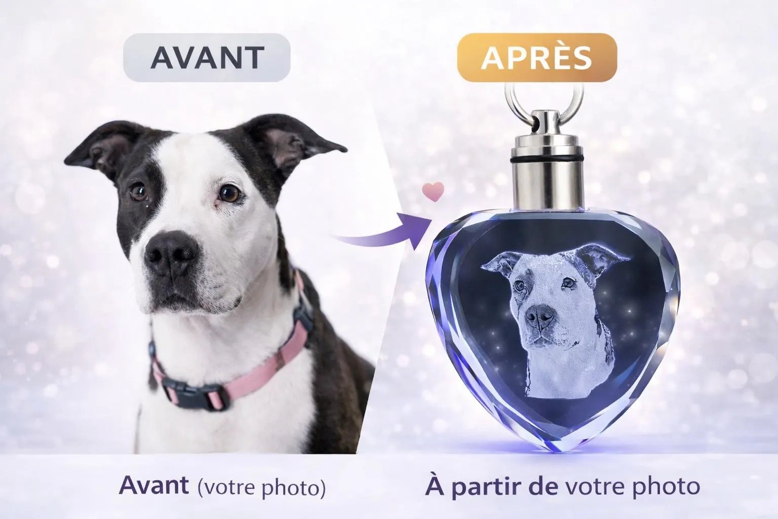 À partir de votre photo, je transforme votre animal en une gravure 3D dans le cristal, révélée par une LED qui le fait littéralement apparaître dans la lumière ✨